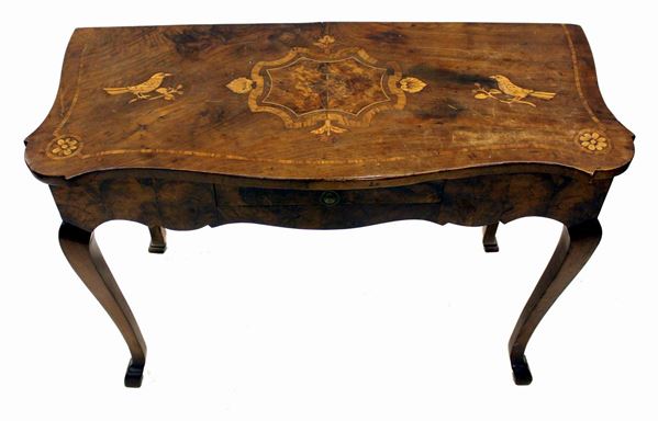 in noce, radica di noce e intarsiato in acero, piano sagomato e intarsiato, fascia centrata da cassetto, gambe sagomate su piede a zoccolo stilizzato, cm 116x50x80, difetti