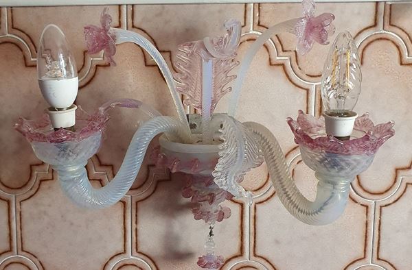 in vetro di Murano nei toni del bianco e rosa, due luci con foglie, cm 33x28, mancante di due foglie e una coppa rotta