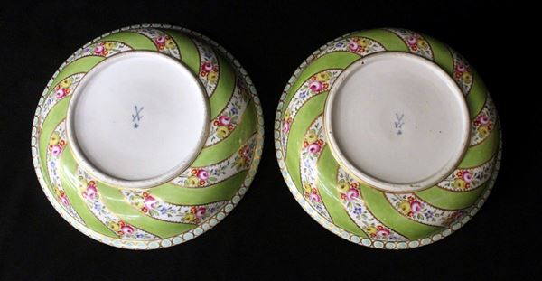manifattura di Meissen, in porcellana dipinta, cavetto e scesa a motivi fioriti, esterno decorato a fasce alternate verdi e a mazzetti fioriti, diam. cm 20
