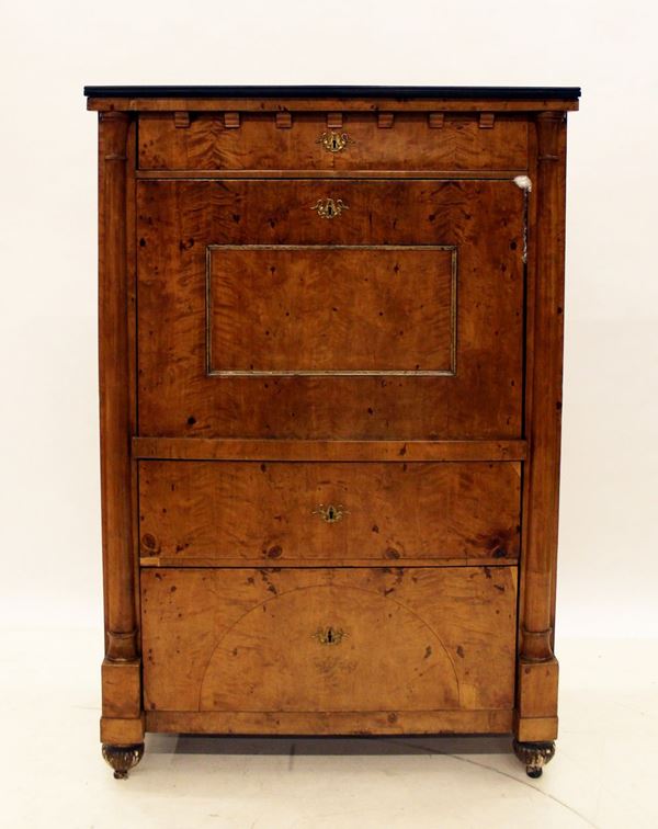 piano in marmo nero del Belgio, lastronato in acero, fronte a tre cassetti a tutta lunghezza, ribalta celante vani a giorno e tiretti, cm 103x50x151, difetti, mancante di chiavi.