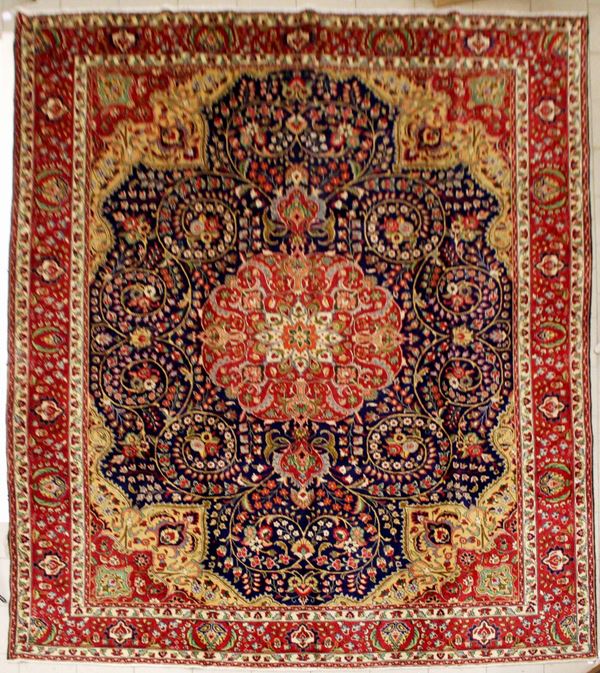 fondo blu, campo a motivo floreale, nei toni del rosso, beige e verde, cm 405x300