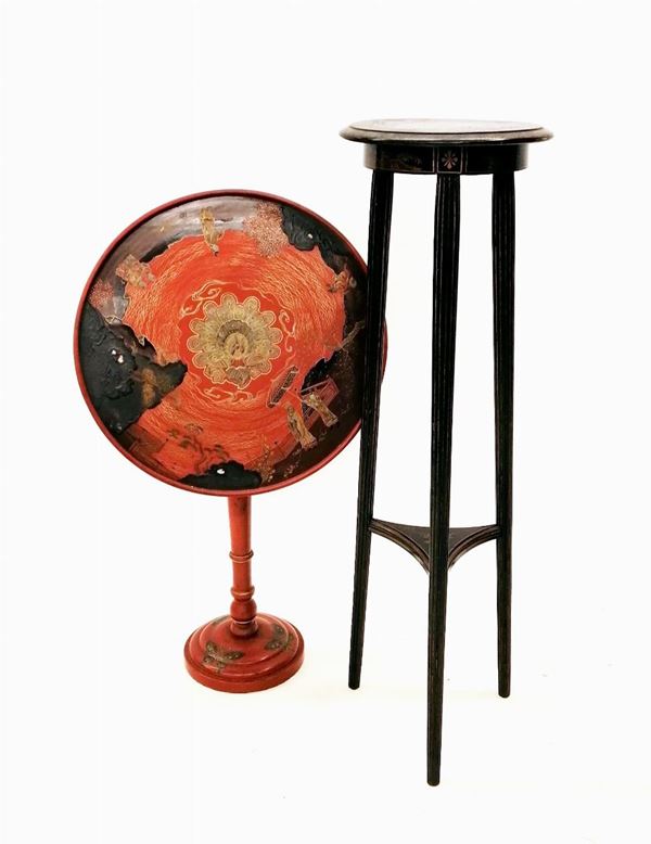 in legno laccato e decorato a cineserie, diam. cm 54, alt. cm 70, portavaso, alt. cm 106