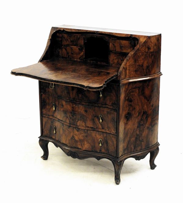 lastronata in noce, fronte e fianchi mossi, tre cassetti e ribalta celante tiretti ad inquadrare vano a giorno, cm 90x50x102, difetti