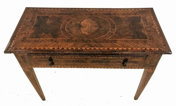 in radica intarsiata, un cassetto, cm 105x50x75, difetti