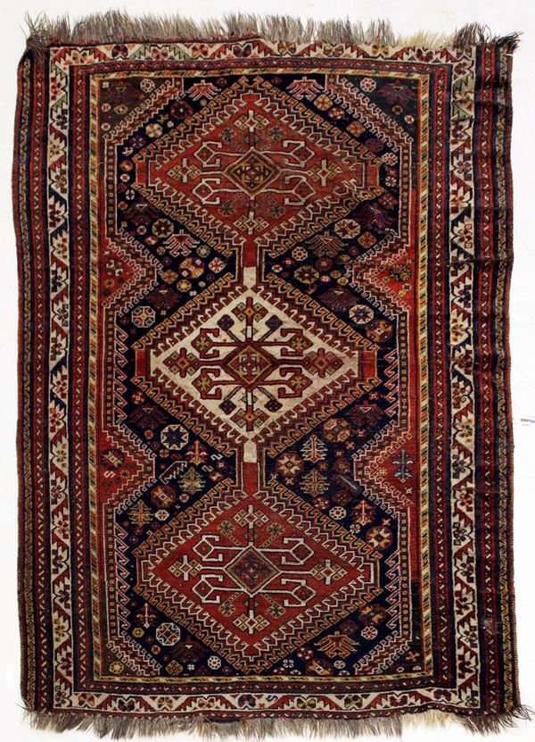 impianto geometrico policromo, campo centrato da tre medaglioni a losanghe, cm 130x178, difetti e usure (2)