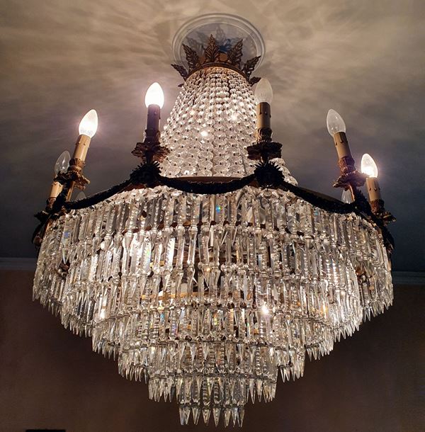 in metallo circolare dorato con gocce, dodici luci, diam. cm 90x100