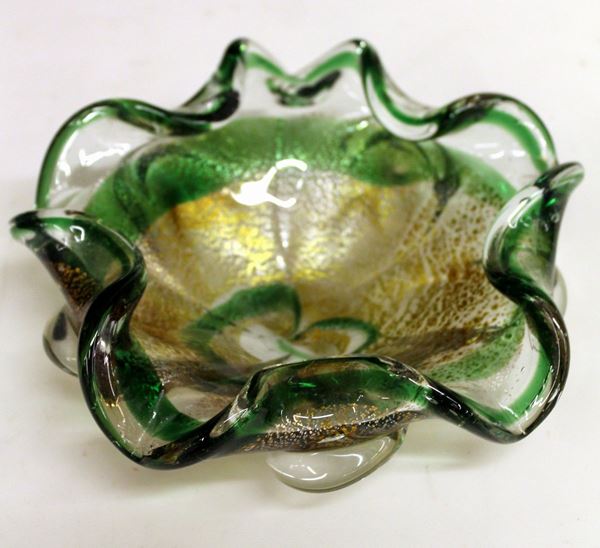 in vetro policromo ad inclusioni in argento, orlo ondiforme, diam. cm 19, lieve difetto al piede