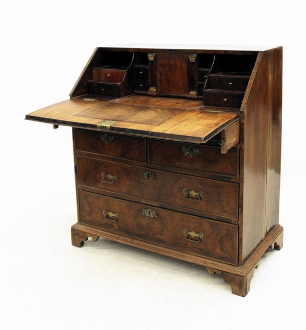 lastronata in mogano, fronte a sei cassetti e ribalta celante tiretti, scarabattolo e vani porta carte, piedi a mensola, cm 95x53x106