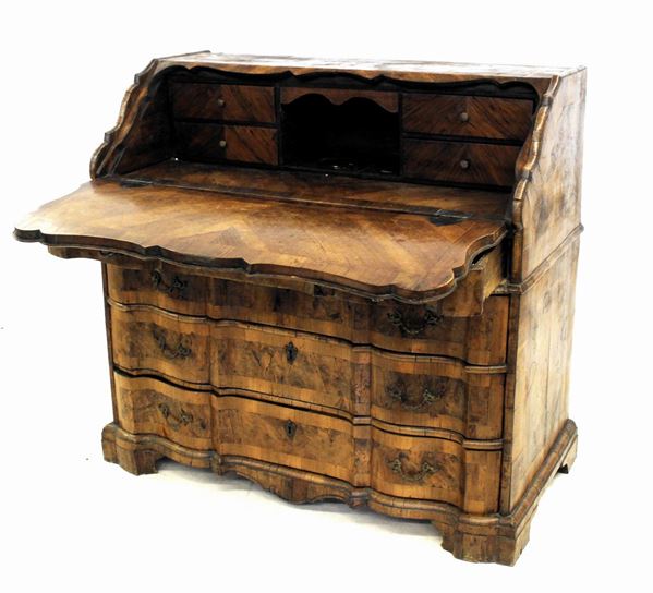 lastronata in noce, fronte a quattro cassetti mossi a tutta lunghezza, ribalta dal profilo a linea spezzata, celante quattro cassetti ad inquadrare vano a giorno, piedi a mensola, cm 116x61x111, difetti e modifiche