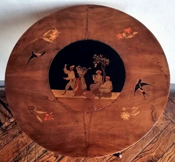 in noce, piano intarsiato con gitani musicanti, alt. cm 74, diam. cm 59