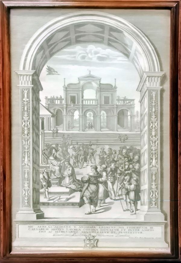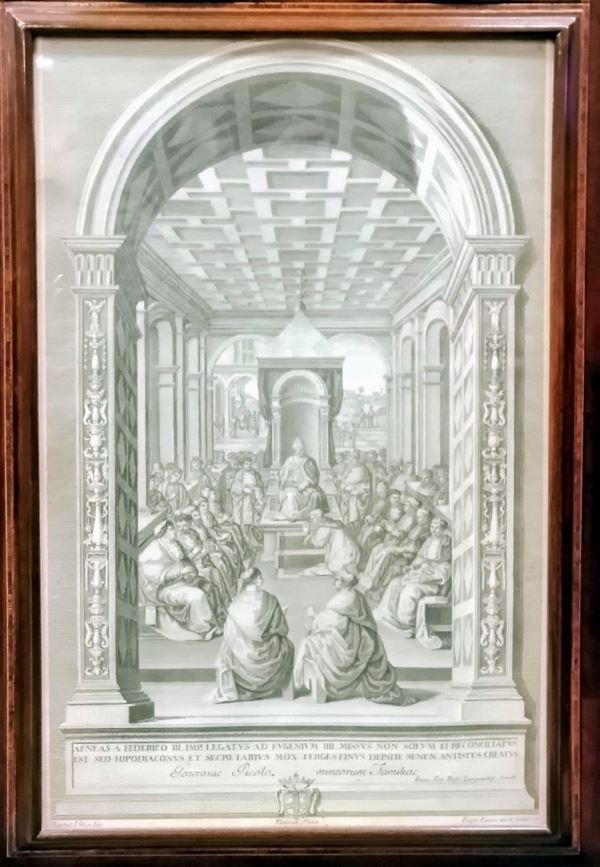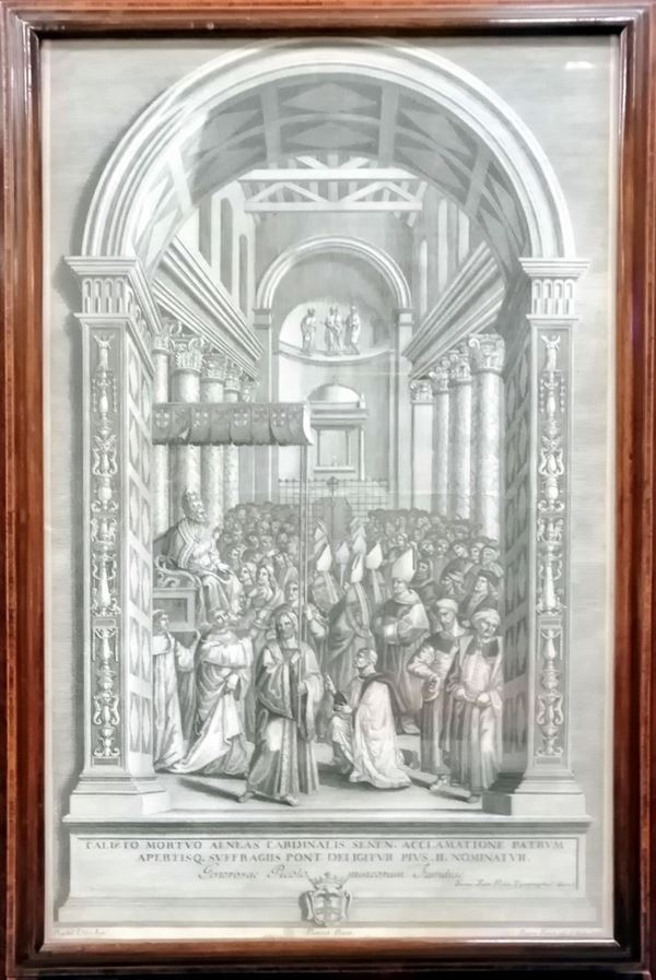 in noce, tre sportelli decorati con sei stampe raffiguranti scene sacre, tre cassetti, cm 225x60x230
