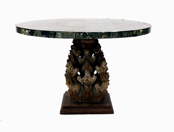 lastronato in marmo verde, su base orientale in legno intagliata e dipinta, diam. cm 89, difetti e restauri