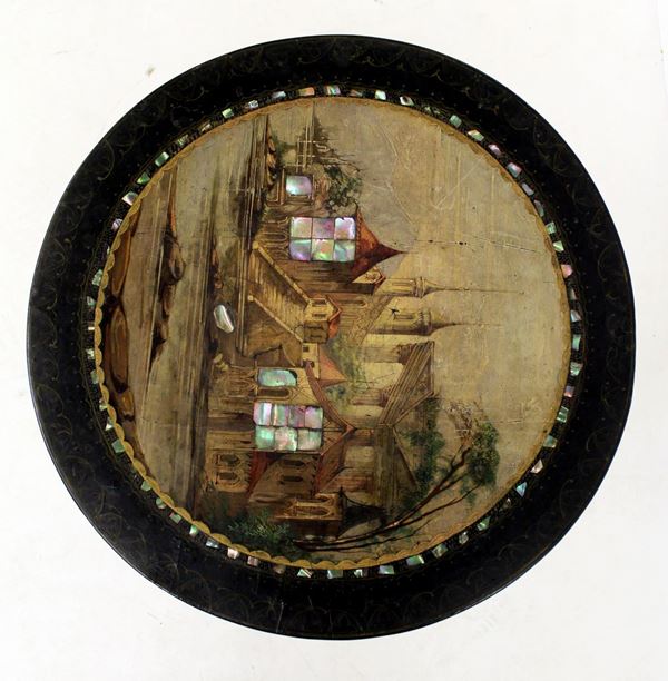 in legno ebanizzato, piano circolare decorato a motivi paesaggistici in policromia e ad incrostazioni in madreperla, fusto tornito lumeggiato in oro su sostegno tripode, diam. cm 60, alt. cm 70, difetti