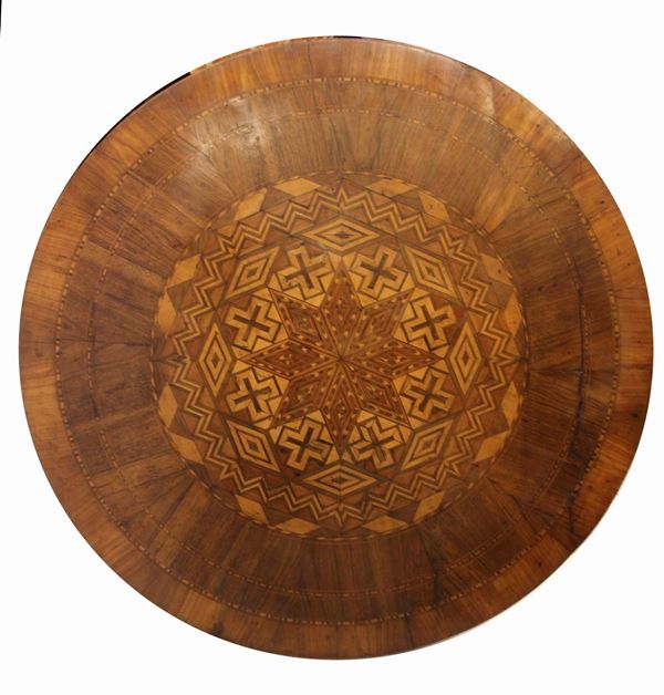 piano circolare riccamente intarsiato a motivo geometrizzante, fusto centrale tornito su basamento triangolare, diam. cm 124, alt. cm 80