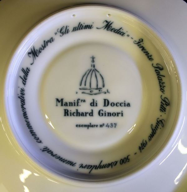 in porcellana, tese decorate bianco blu, cavetti centrati da clipei a profili a rilievo, diam. cm 26 (3)