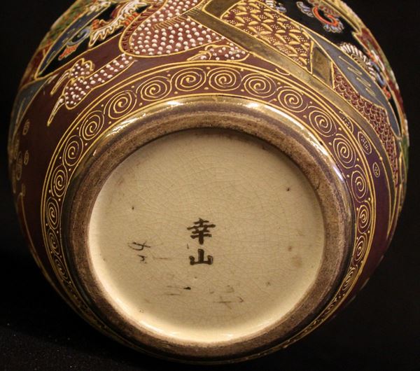 in ceramica decorata a rilievo, in policromia e lumeggiature auree, a motivi figurati, alt. cm 21, difetti al tappo