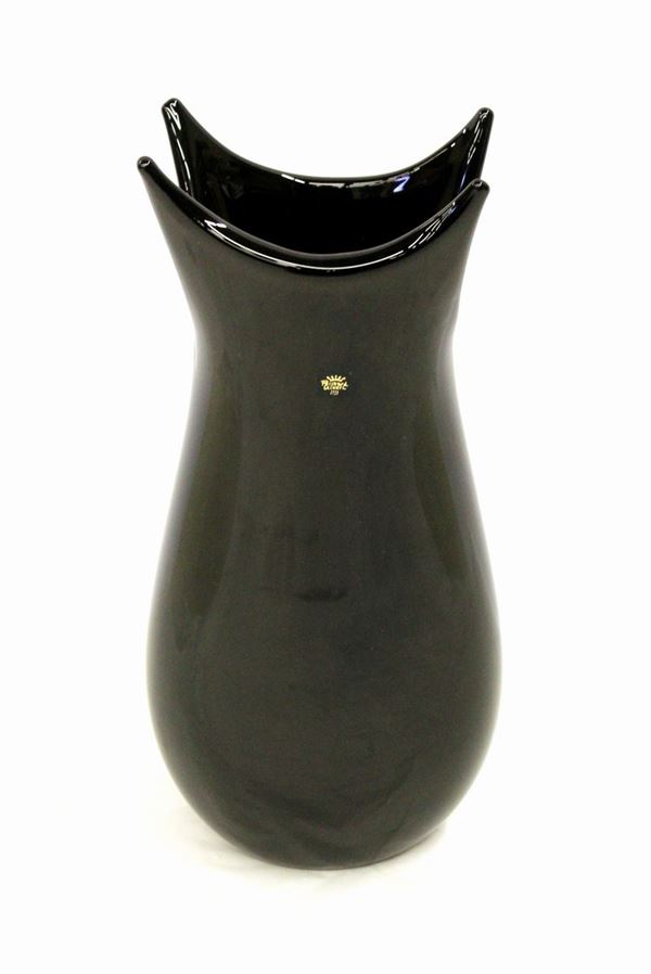 in cristallo nero opalino, corpo svasato, orlo pinzato, alt. cm 40x18
