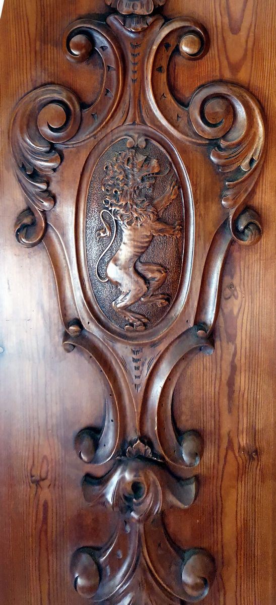 in legno dolce, quattro sportelli con formelle intagliate a stemma, cm 280x55x250