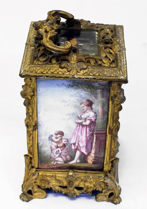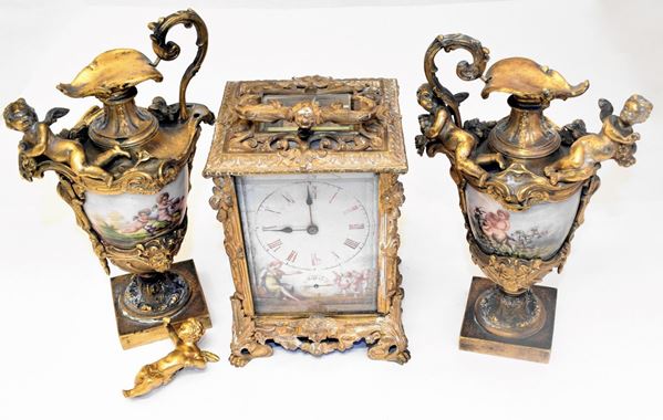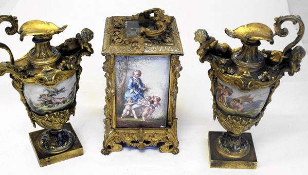 in bronzo dorato e palcche in porcellana decorata a figure e putti