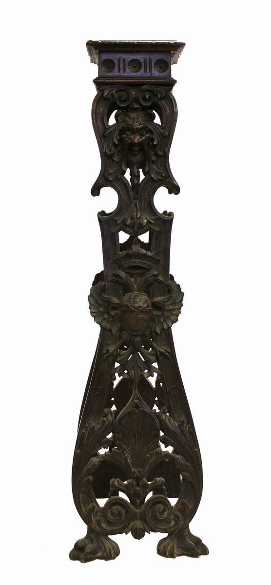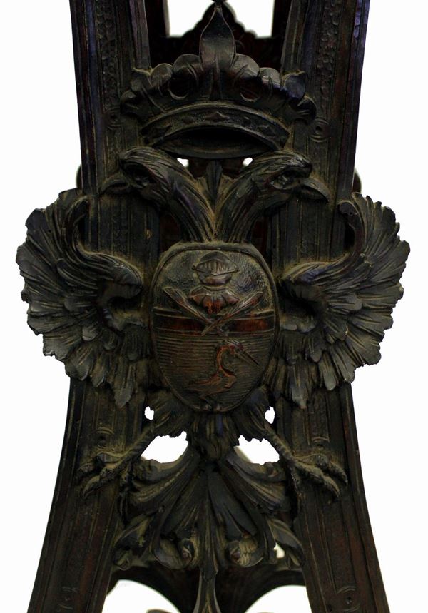 in noce, piano quadrato, strutture intagliate a mascheroni e aquila bicipite centrata da scudetto nobiliare, cm 38x41x135, difetti