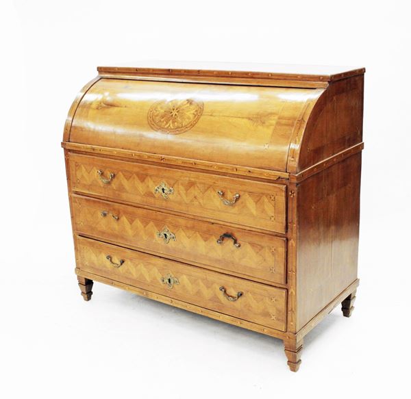 lastronata in ciliegio, intarsiata e filettata, rullo celante tiretti e piano estraibile, tre cassetti sovrapposti a tutta lunghezza, gambe troncopiramidali, cm 127x63x118, difetti