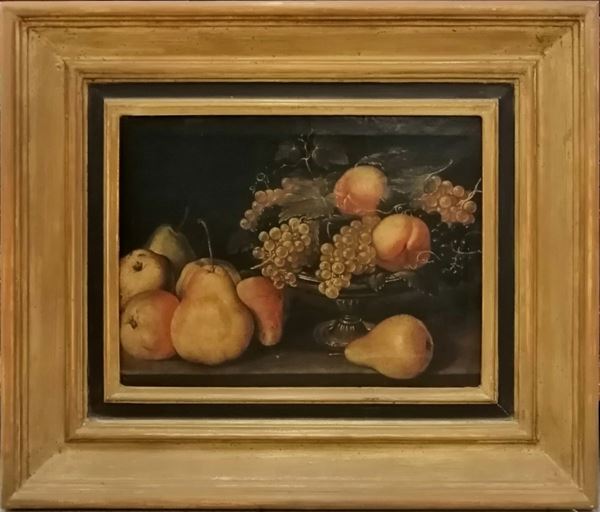 NATURA MORTA CON FRUTTA E PAESAGGIO AL TRAMONTO