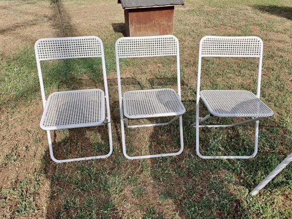 in ferro battuto, diam. cm 100 e quattro sedie quadrate