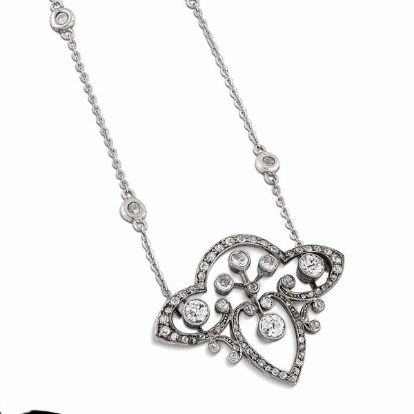 Composta da catenina con pendente impreziositi da diamanti taglio brillante, taglio vecchio e a rosa, per ct 2.30 circa, pendente cm 4x3, lungh. cm 42, g 12
