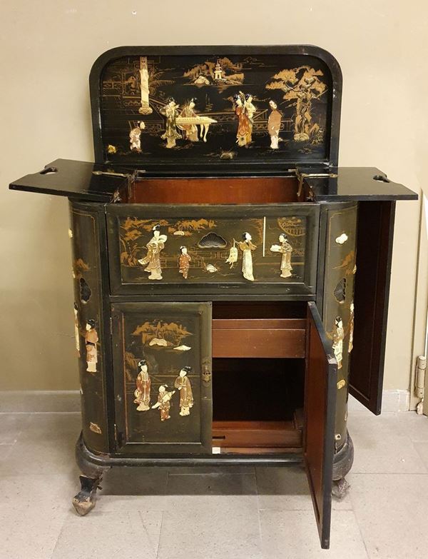 Mobile bar, sec. XX in legno di canfora con decori orientali a rilievo quattro sportelli e piano apribile, cm.92x45x107, difetti