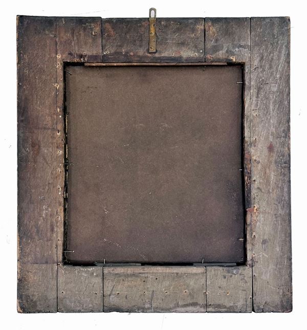 in legno intagliato guilloché, luce rettangolare, luce cm 50,5x57, ingombro cm 75,5x83, difetti