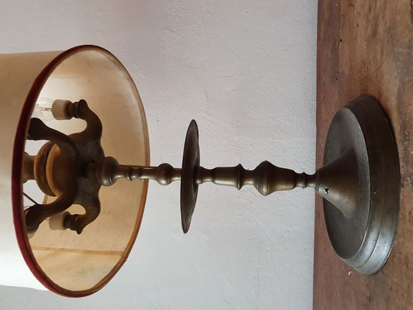 in bronzo a quattro luci, completa di applicazione elettrica e paralume, cm 70