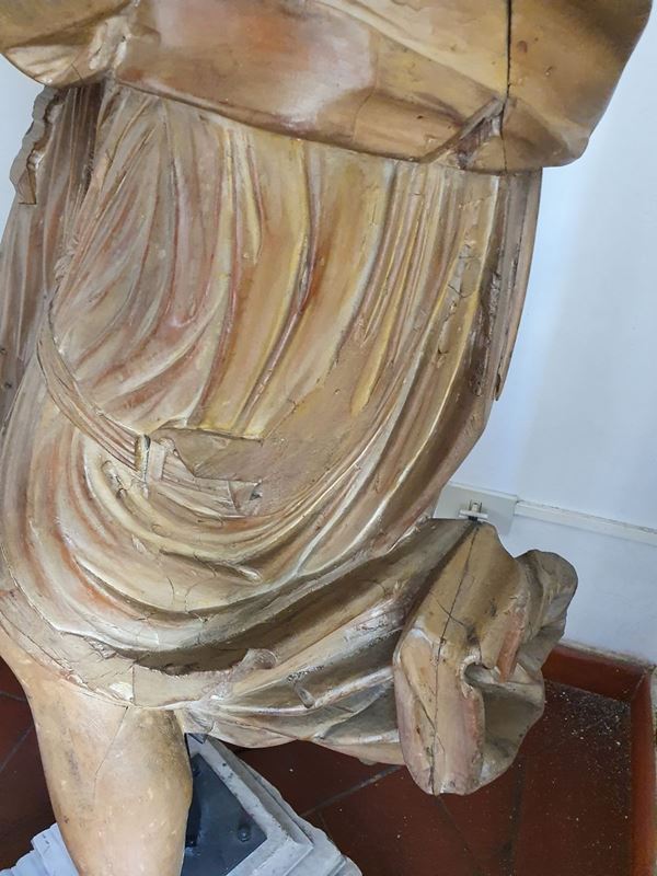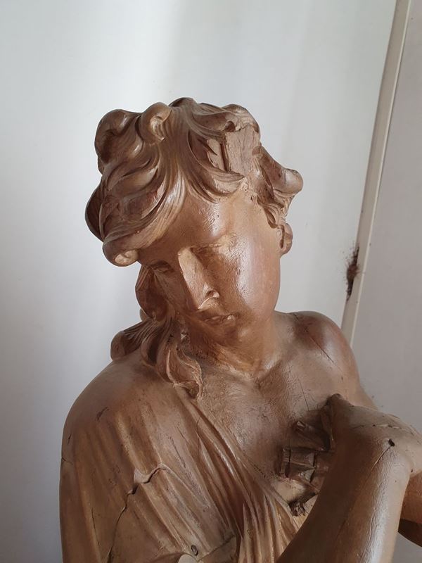 scultura in legno, cm 145, su base in marmo di cm 23, difetti e mancanze