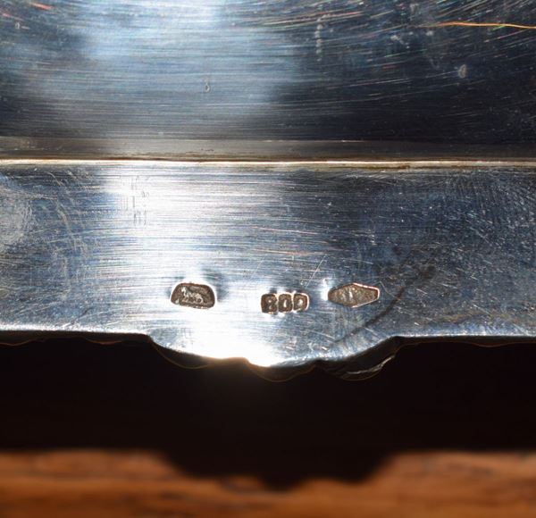 in argento cesellato , bordo baccellato , due anse , cm 67X36 ,g 3000