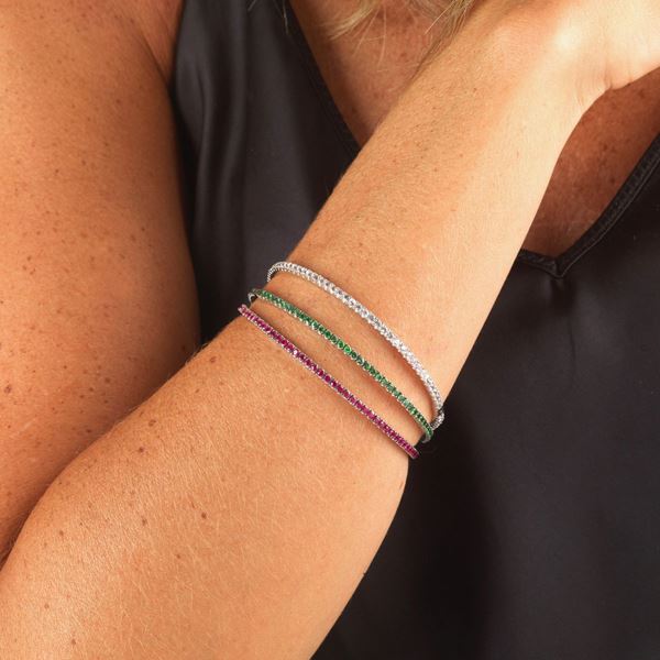 in oro bianco 18kt, uno impreziosito da una fila di pietre di colore verde, uno da una fila di pietre di colore rosso,