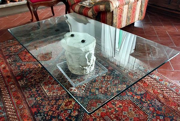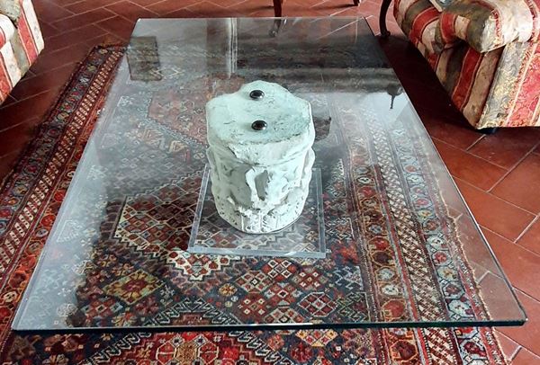in marmo con rilievi, su base in plexiglas e piano in cristallo, cm 33(capitello) e 152x92x42, difetti e mancanze