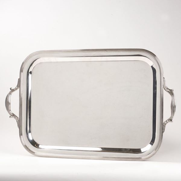 in metallo argentato, di forma rettangolare ciascuna con due anse a volute, cm 80x53,5 e cm 70x44