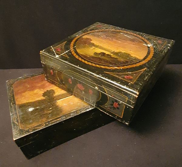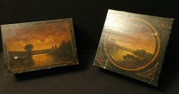 In legno laccato e decorato a paesaggi fluviali, cm 25x18 e cm 22x22, difetti
