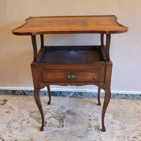 in noce, piano sagomato trasformabile in vassoio, un cassetto, gambe moss, cm 83x59x75
