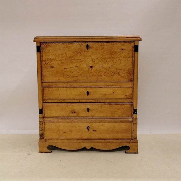 in radica di tuia, sportello a ribalta, all'interno quattordici cassettini e sportello, colonne laterali, tre cassetti, cm 106x40x120