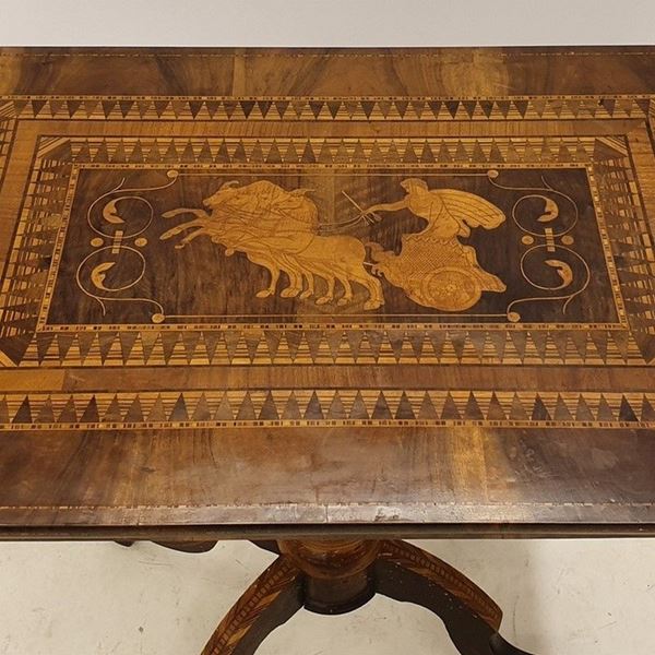 in noce con piano rettangolare inarsiato a figure mitologiche, gamba tornita su tre piedi mossi, cm 90x60x78