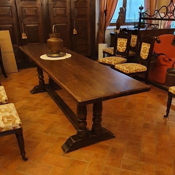 in noce, gambe tornite riunite da traversa,cm 280X65X81
