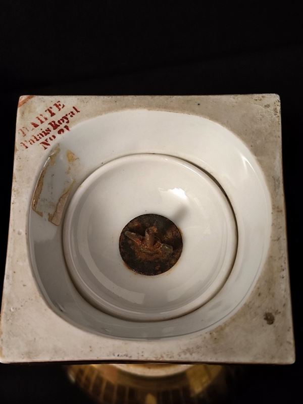 in porcellana nero oro, con pitture a scene di interni,manici a cigno,cm 18x33,da restaurare.