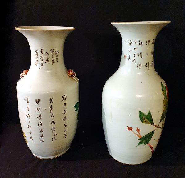 in maiolica con decori a fiori, uno con manici a teste di animali, cm 45 e cm 44, firmati