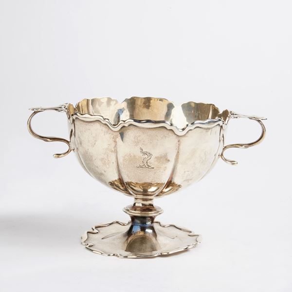 in argento, base circolare sagomata come il profilo delle coppe, due anse a volute, diam. cm 12, g 225