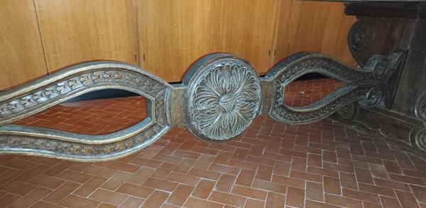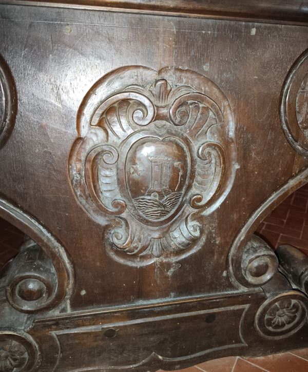 in noce, gambe a vaso intagliate con stemma, cm 340x105, difetti