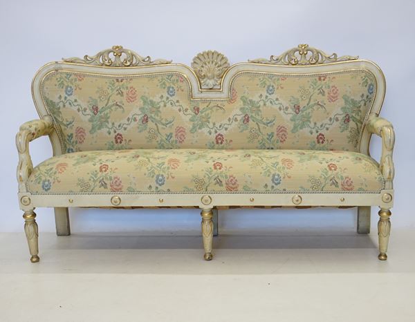 composto da divano, quattro poltrone e tavolino da centro, in legno laccato e intagliato, imbottito e ricoperto in stoffa a fiori, divano cm 195x65x108, poltrone alt. cm 106, tavolino cm 78x56x75 ( 6 )