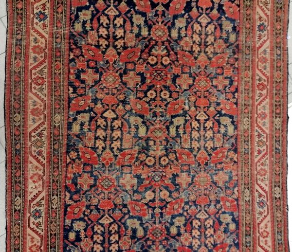 fondo nei toni del rosso a motivi geometrici, cm 150x335, difetti
