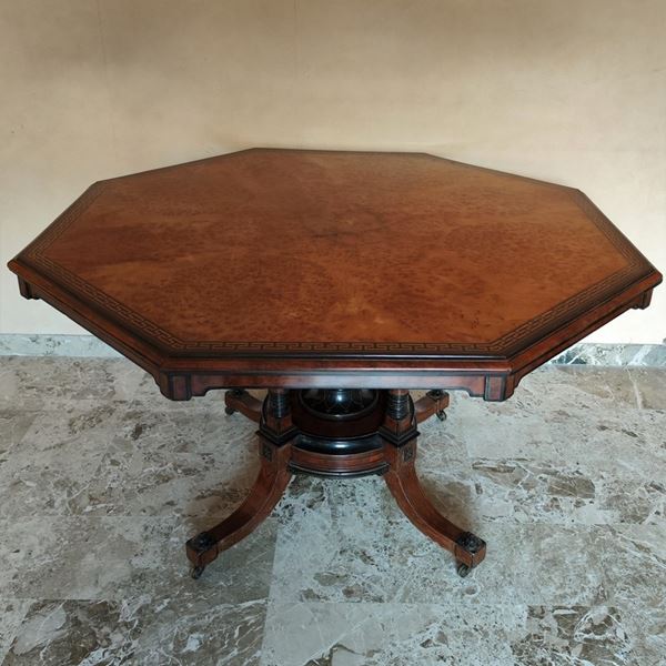 piano ottogonale in radica con cornice a finto intarsio, fusto centrale con finale a quattro piedi mossi su rotelle,