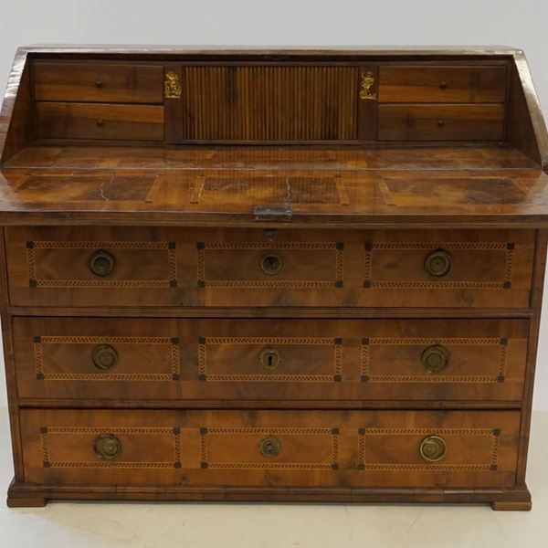 in noce filettato, sportello a ribalta con applicazioni in bronzo, tre cassettini bella fascia tre cassetti sottostanti, cm 131x64x112, piccole cadute alla listra