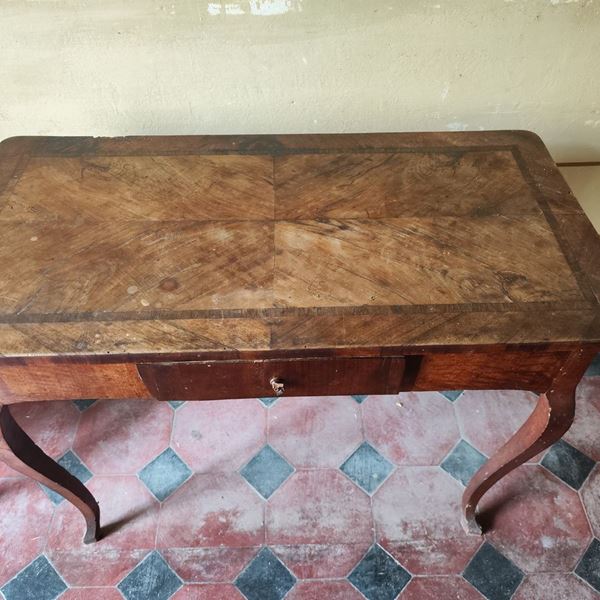 in noce filettato, un cassetto, sostenuto da quattro gambe mosse, cm 97x48x77, difetti